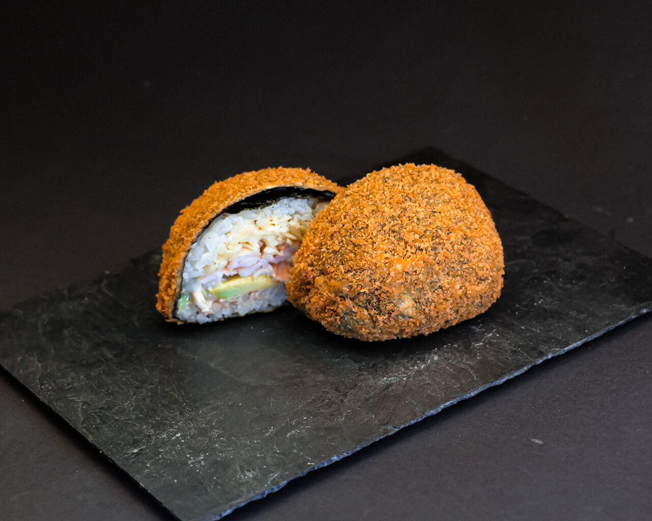 Gambas, aguacate, queso duro, arroz, nori, japonesse maynnais, tobika, rebozado, pan rallado.