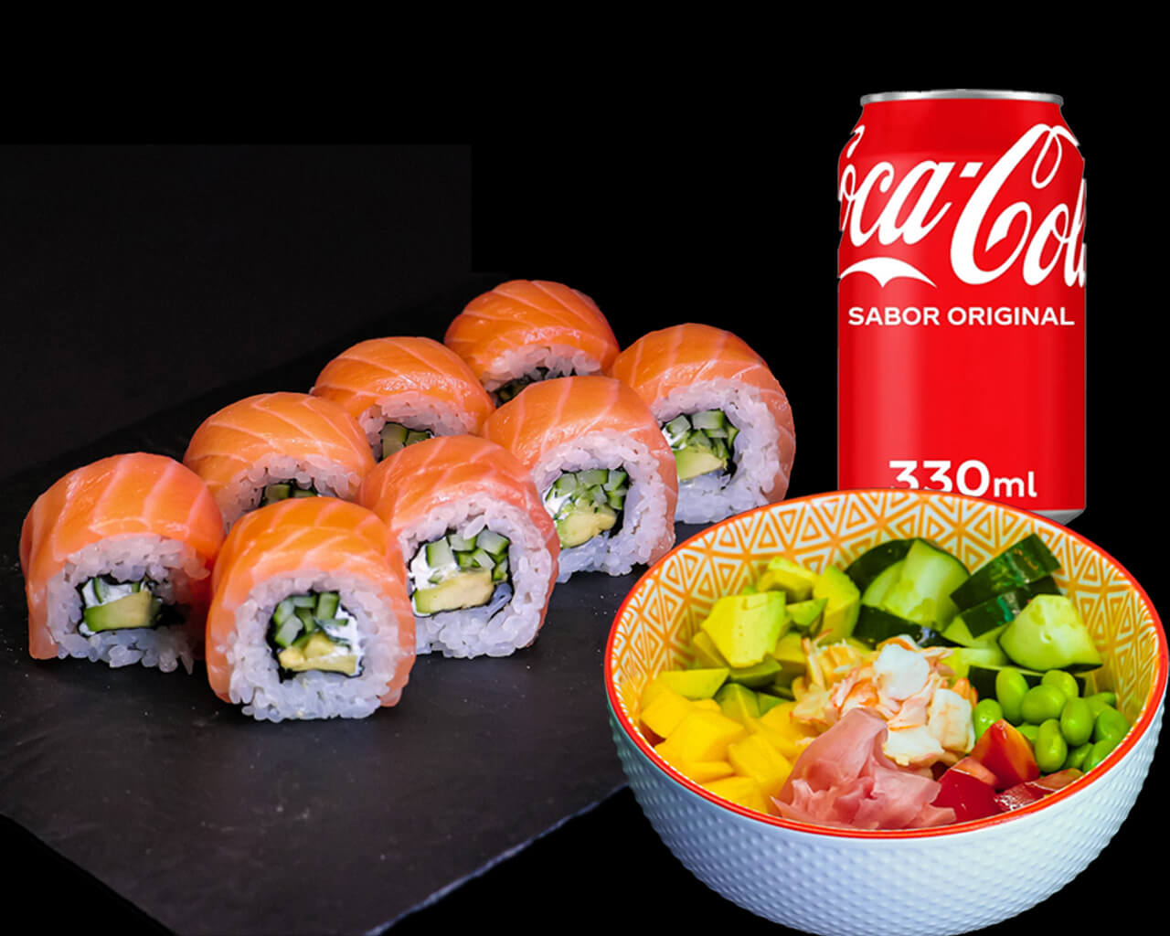 Roll Philadelphia clásico (8 pzs.) + Poke bowl de gambas + Coca-Cola Original 330ml.
