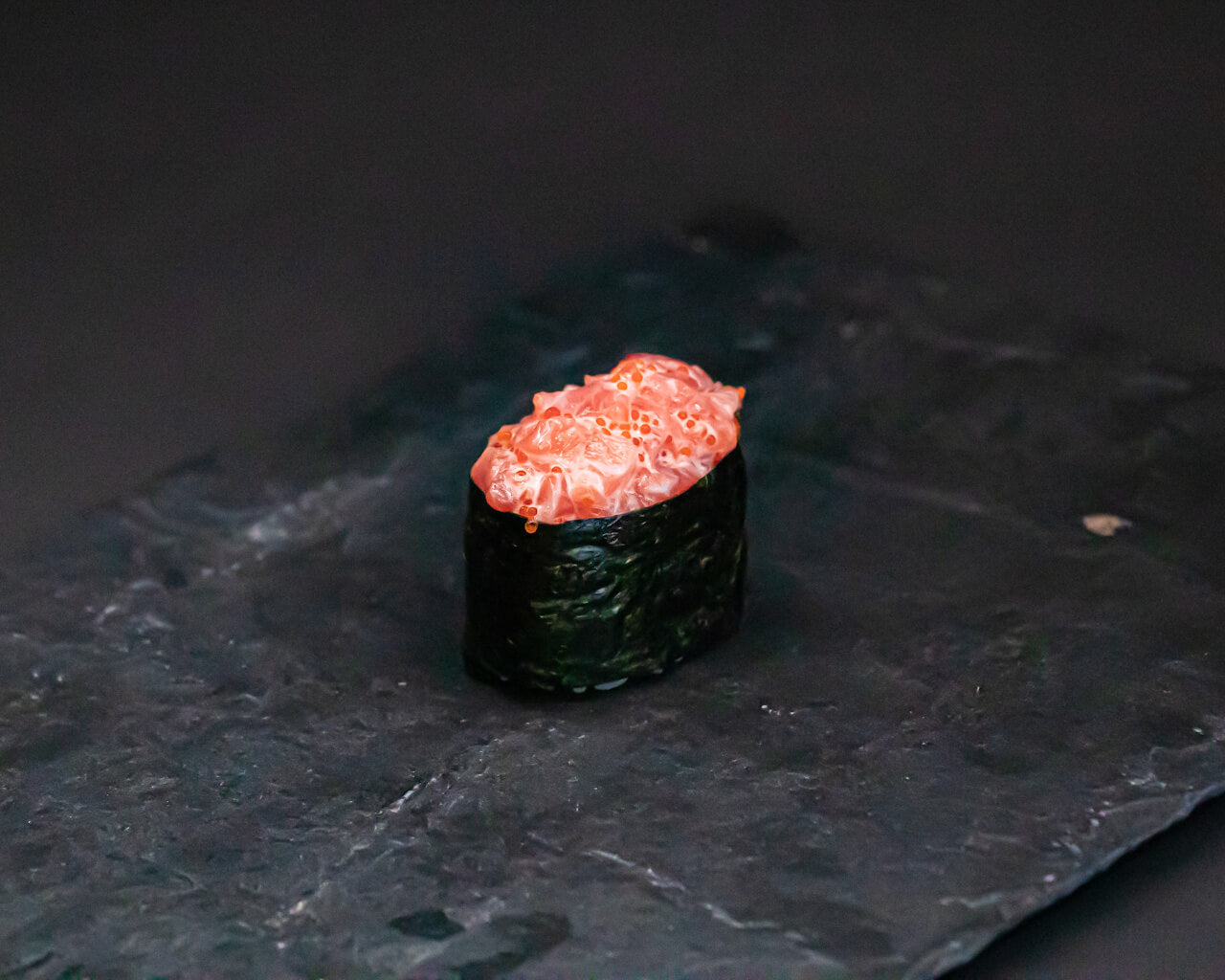 Arroz, nori, salmón, mayonesa japonesa, tobika.
