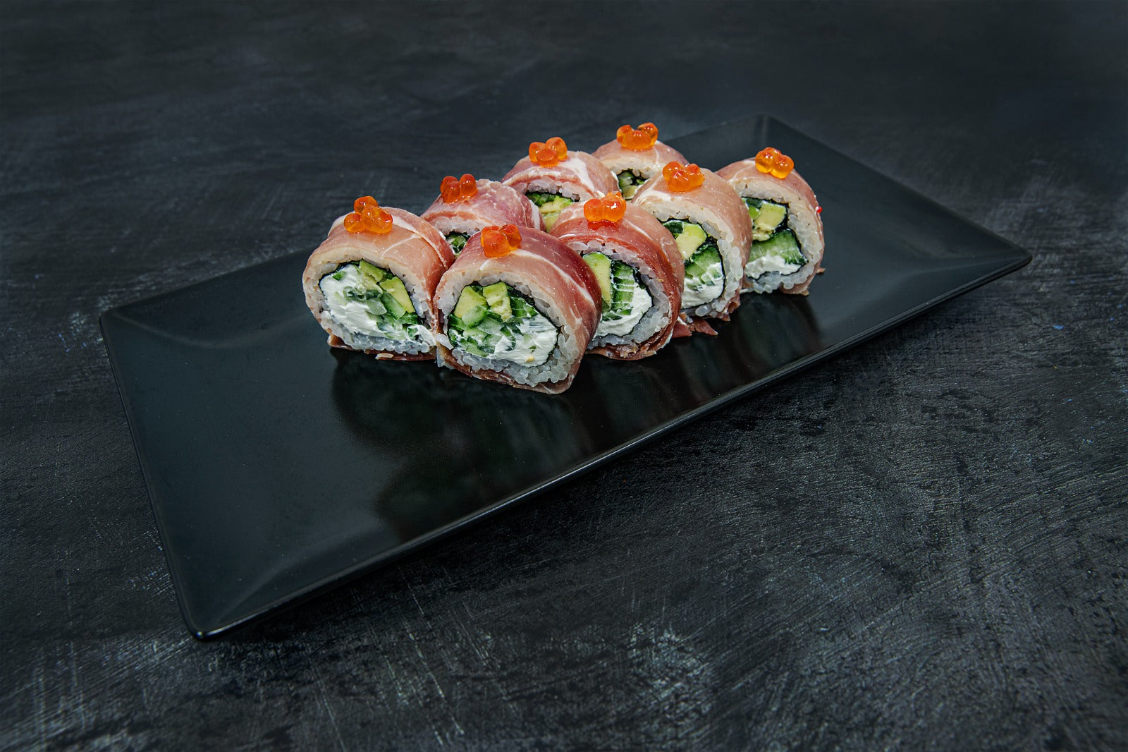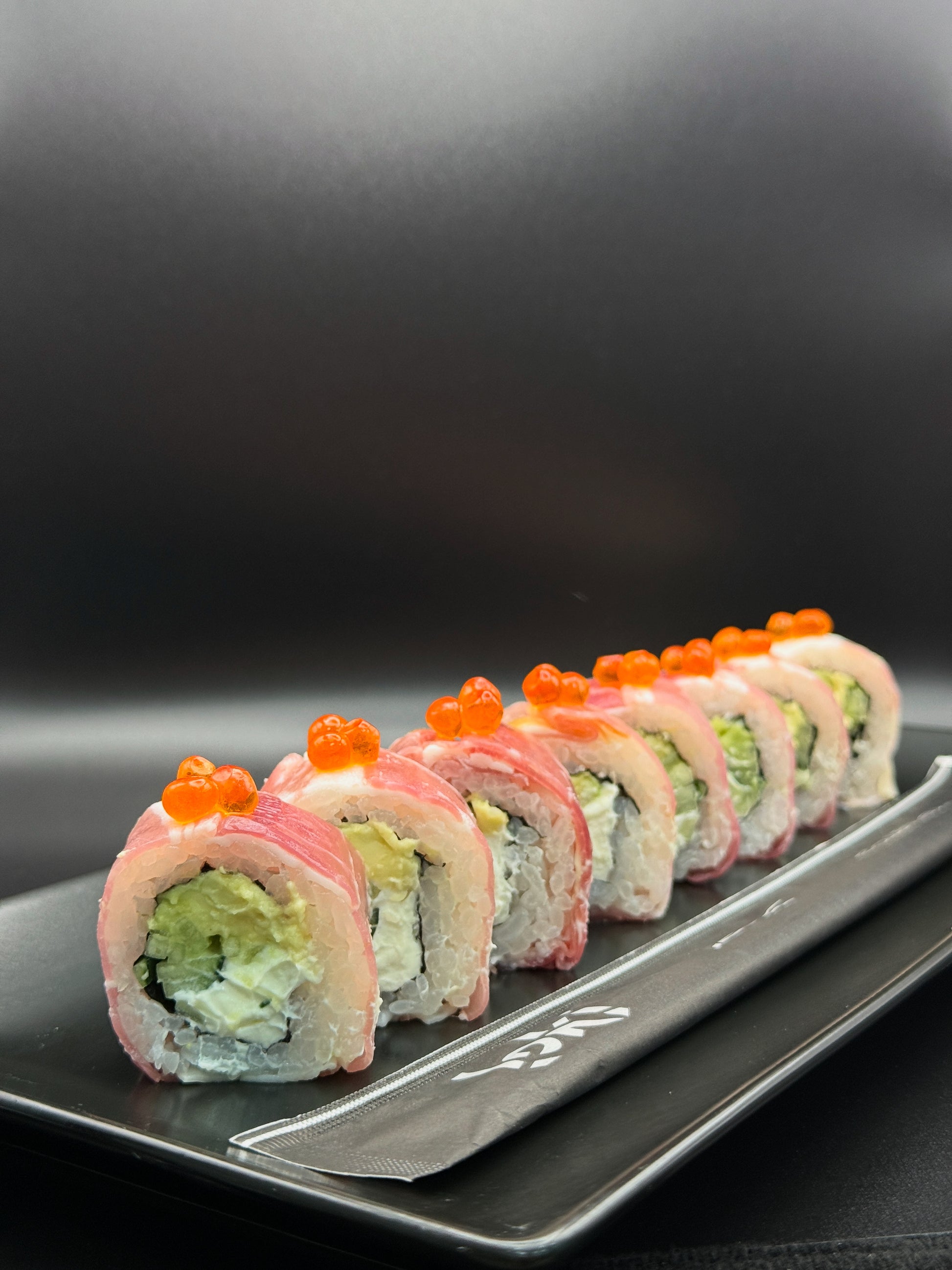 Arroz, queso Philadelphia, aguacate, jamón, pepino, nori.