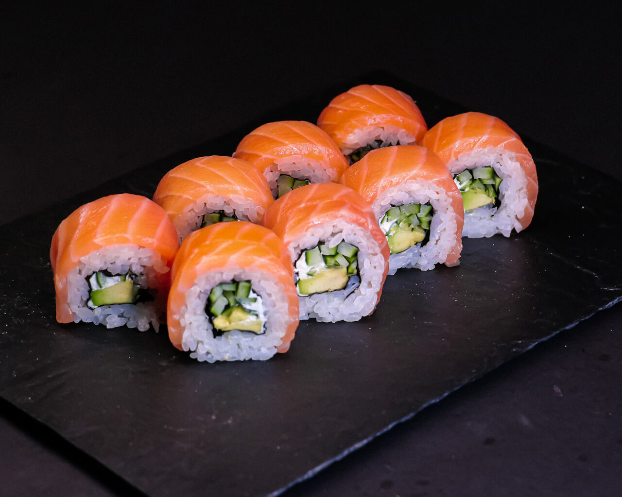 Arroz, salmón, nori, pepino, aguacate, queso Philadelphia.