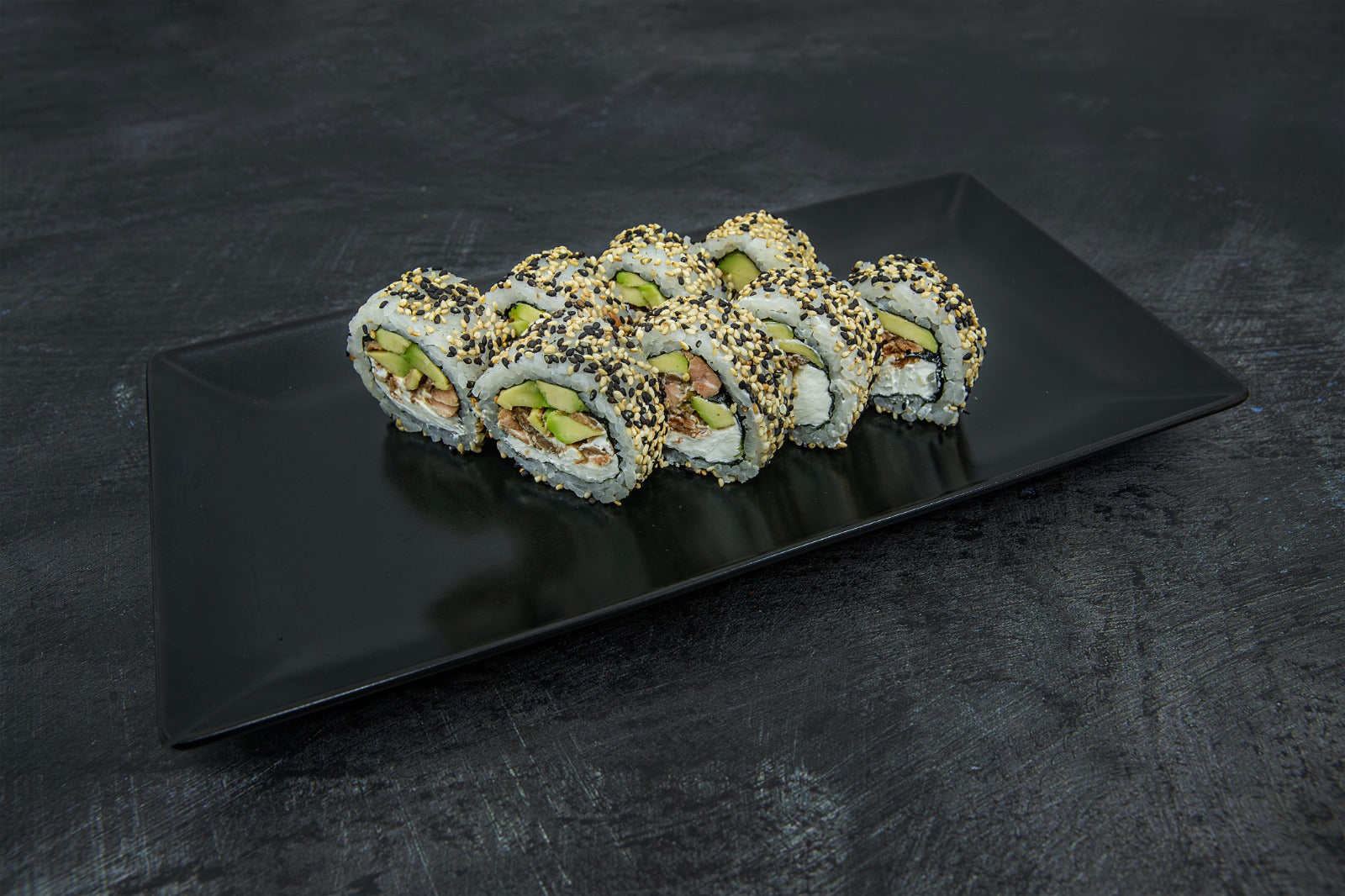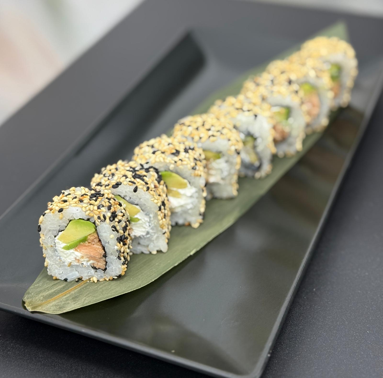 Arroz, nori, queso Philadelphia, aguacate, sésamo, salmón frito.